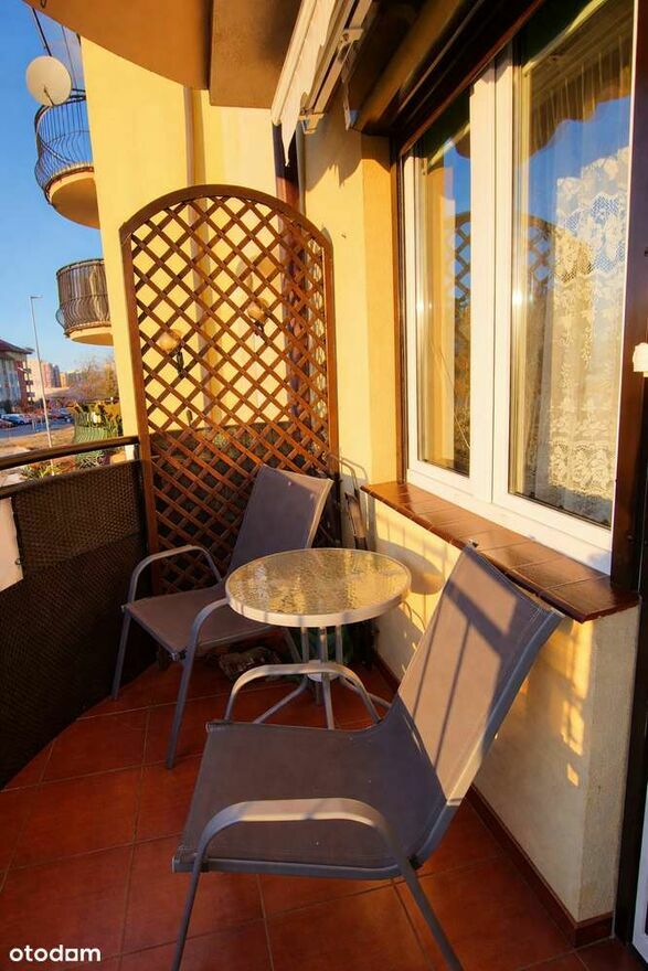 Ogromnym atutem jest balkon z widokiem na otwartą przestrzeń, wyposażony w markizę chroniącą przed słońcem, dzięki czemu można komfortowo spędzać tu czas nawet w upalne dni.