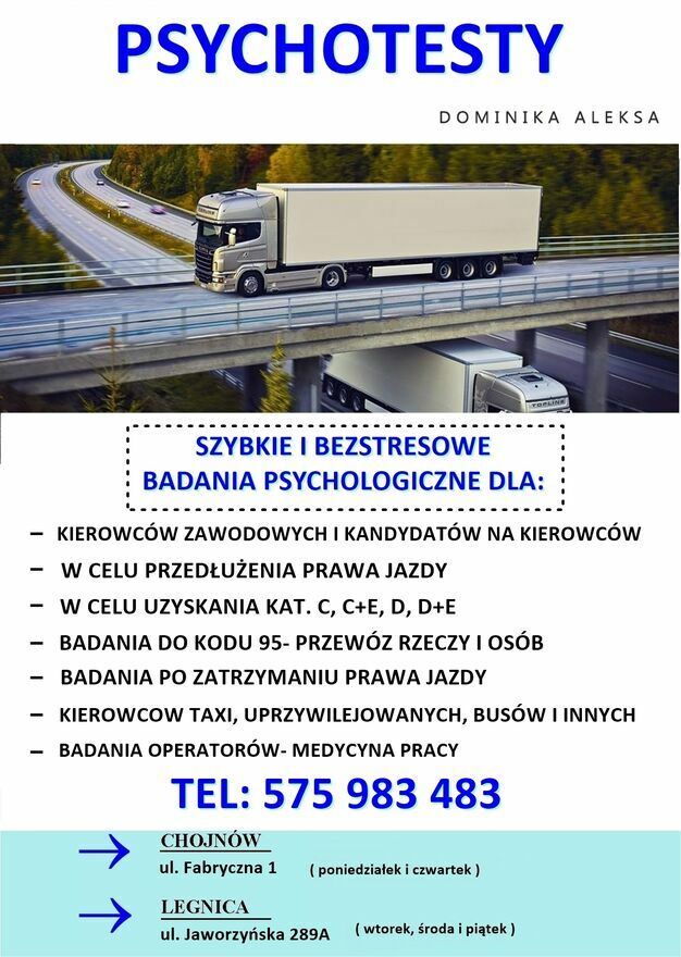 Badania PSYCHOLOGICZNE i LEKARSKIE , MEDYCYNA PRACY Legnica