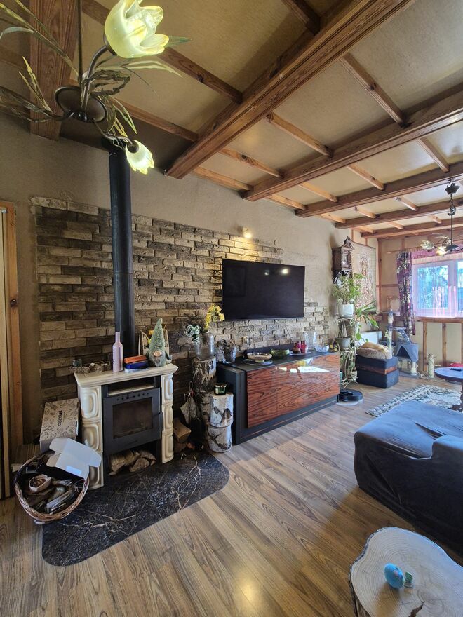 - salon z kominkiem połączony z kuchnią i jadalnią