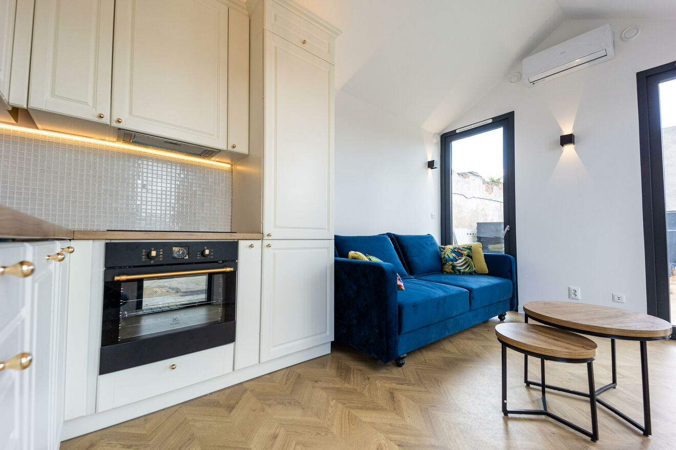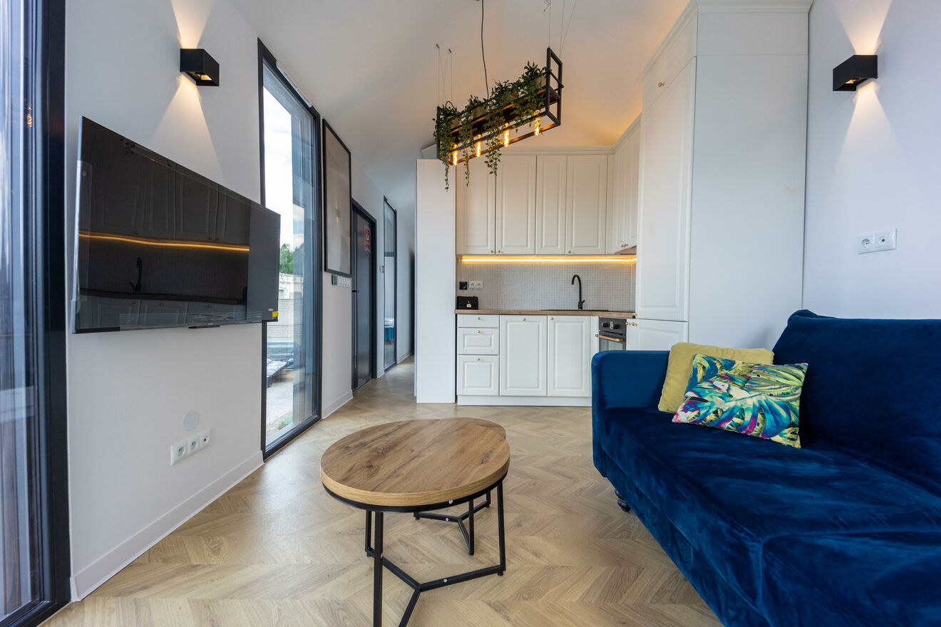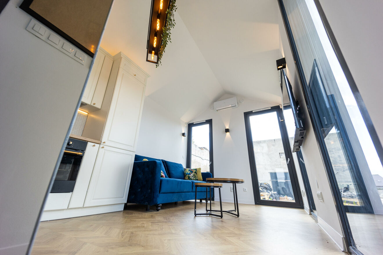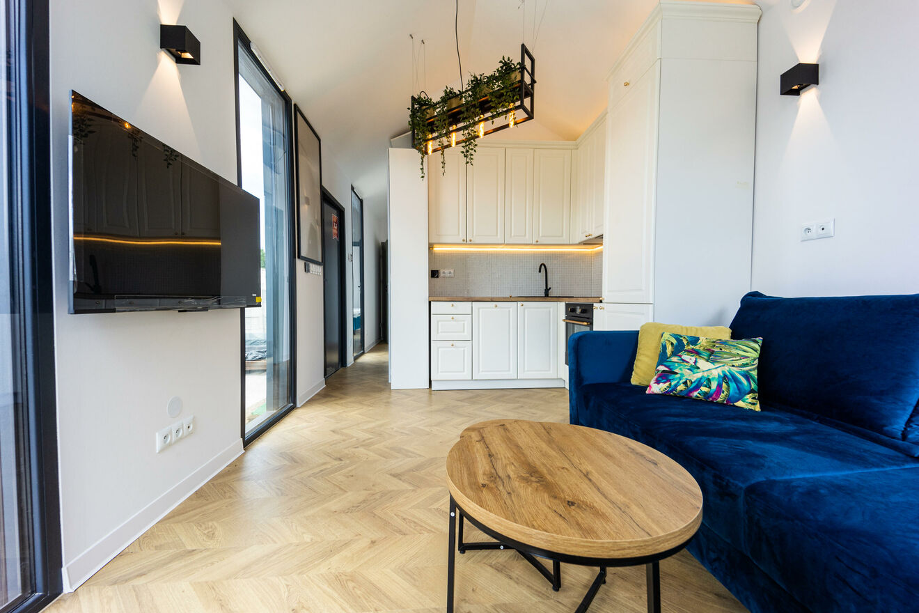 - AGD i RTV: domek jest kompleksowo wyposażony w niezbędny sprzęt AGD i RTV: piękna kuchnia z miejscem do przechowywania oraz lodówką, piekarnikiem, płytą indukcyjną z zabudowanym okapem, zmywarką. Kuchnia otwarta na salon wyposażony w wypoczynek, stoliki kawowe oraz wysokiej klasy telewizor. Dwie sypialnie wyposażone w wygodne łóżka, pojemną szafę oraz dodatkowy telewizor, który zapewni rozrywkę w różnych częściach domku.