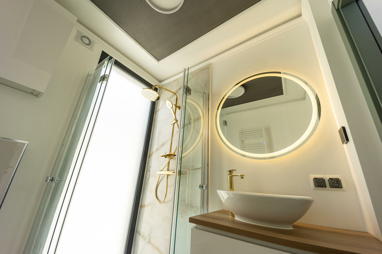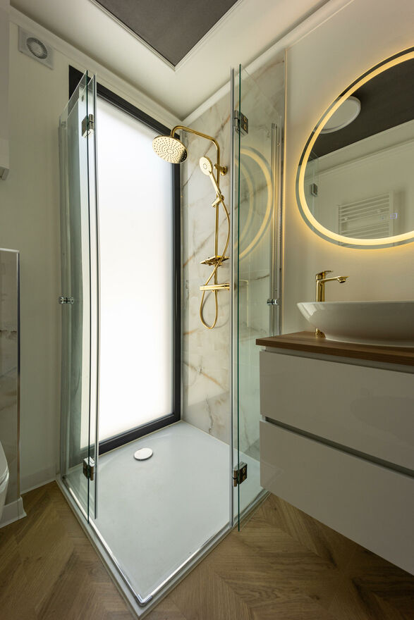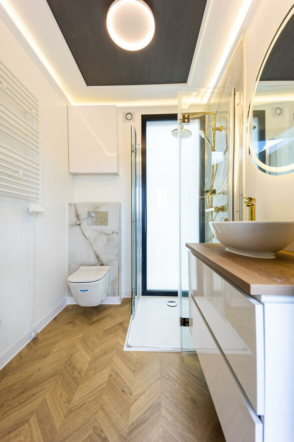 - LUKSUSOWA ŁAZIENKA: Przestronna łazienka została bogato wyposażona, oferując komfortowy prysznic oraz wszystkie niezbędne udogodnienia, w tym miejsce na pralkę oraz suszarkę.