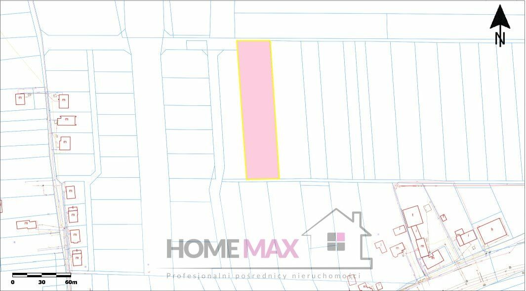 Działka ma powierzchnię prawie 50 arów, położona jest w sąsiedztwie osiedla domów jednorodzinnych. Foremny kształt prostokąta o wymiarach ok. 33x140 m, płaski teren oraz orientacja frontu działki na północ-południe umożliwią dogodne zagospodarowanie działki w całości, bądź też wydzielenie mniejszych działek. Najbliższe dostępne media w odległości 150-200 m od działki.