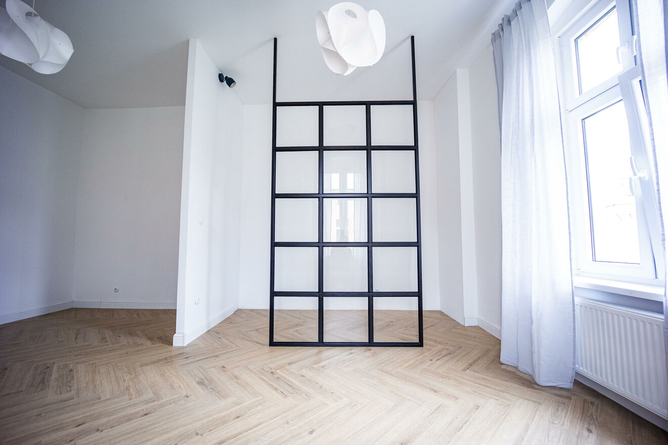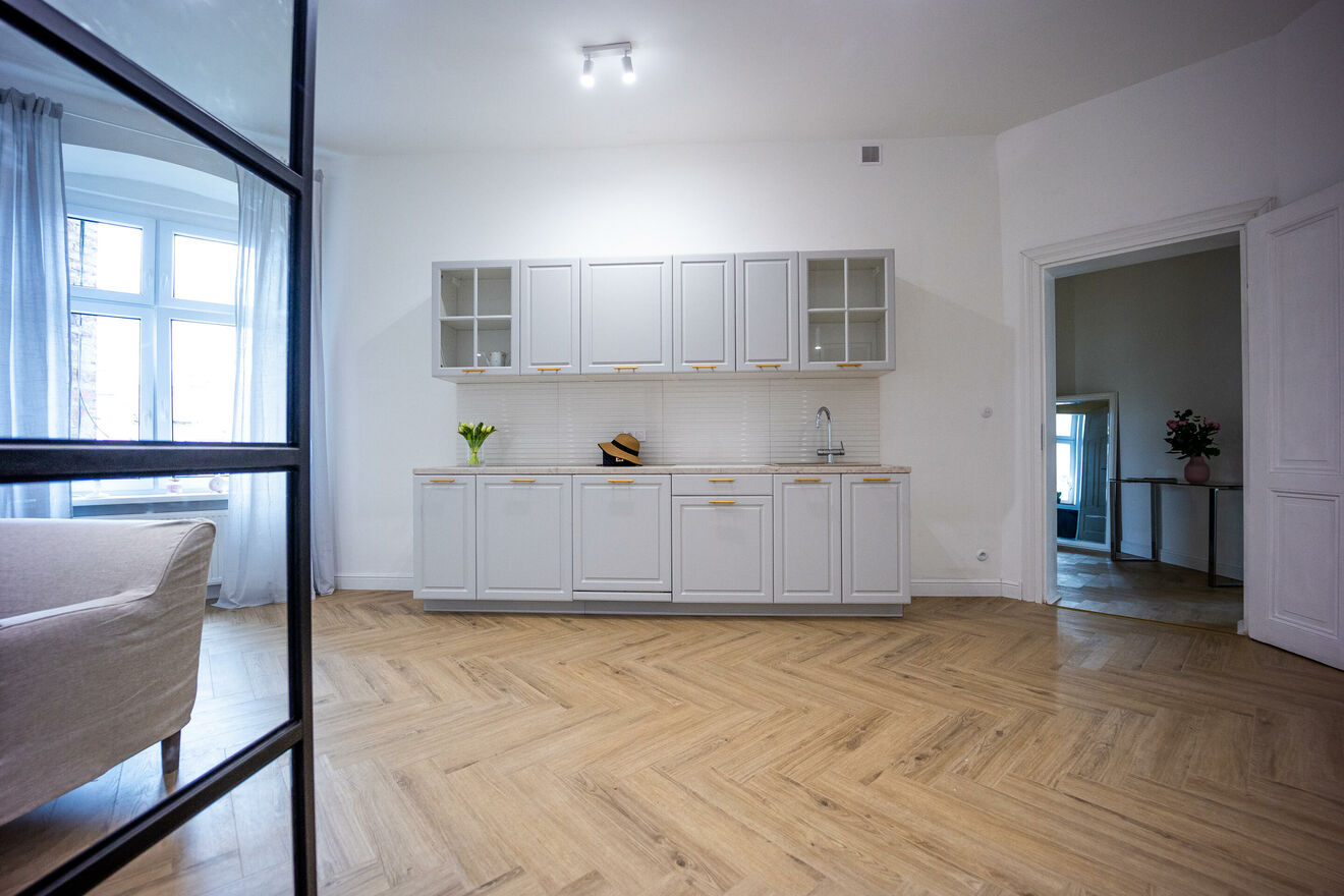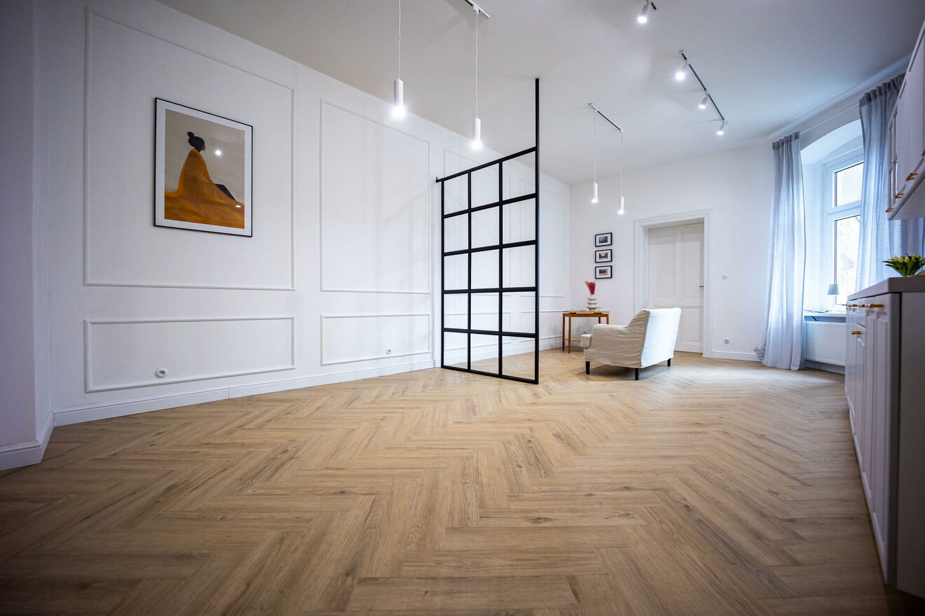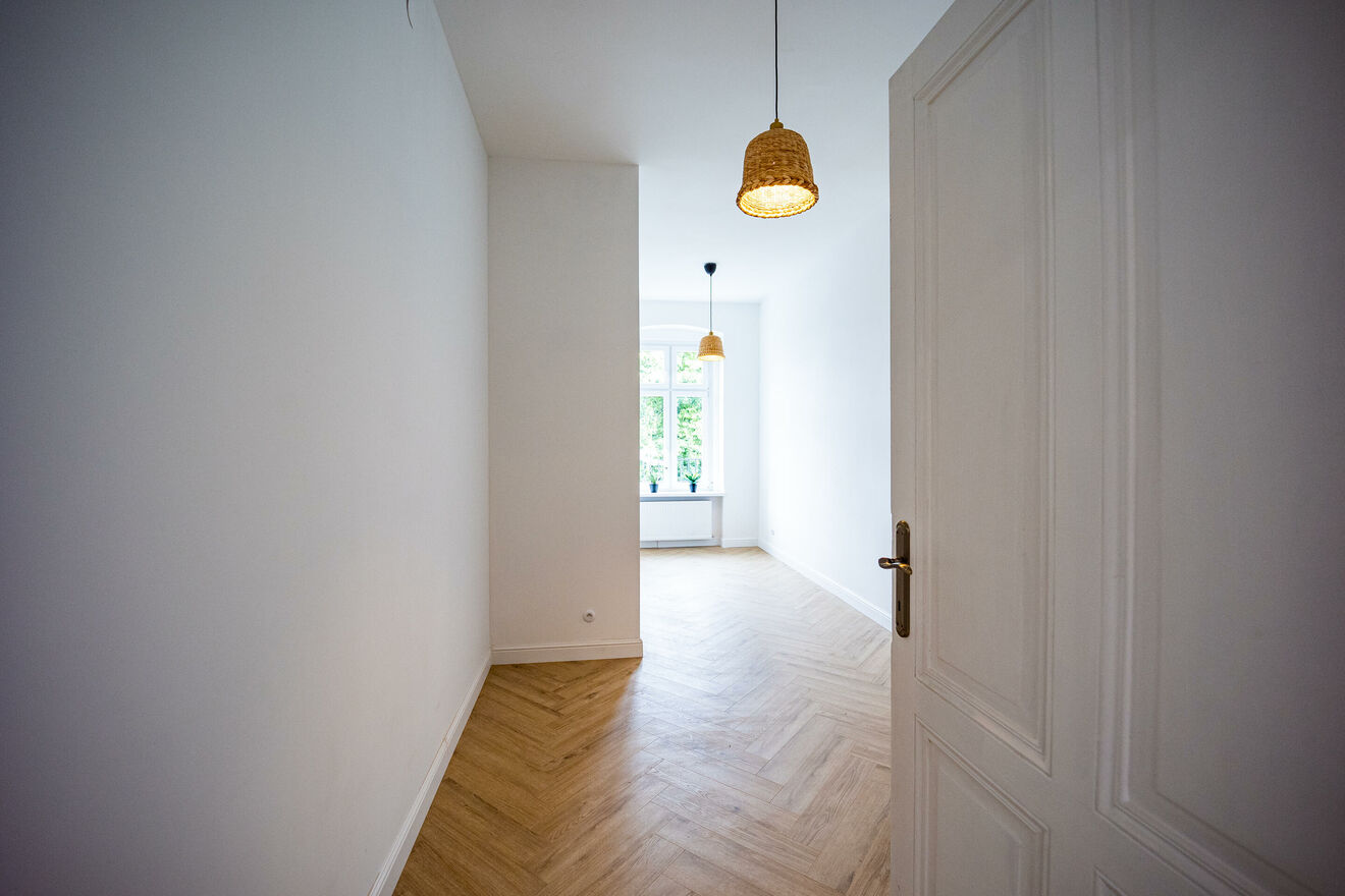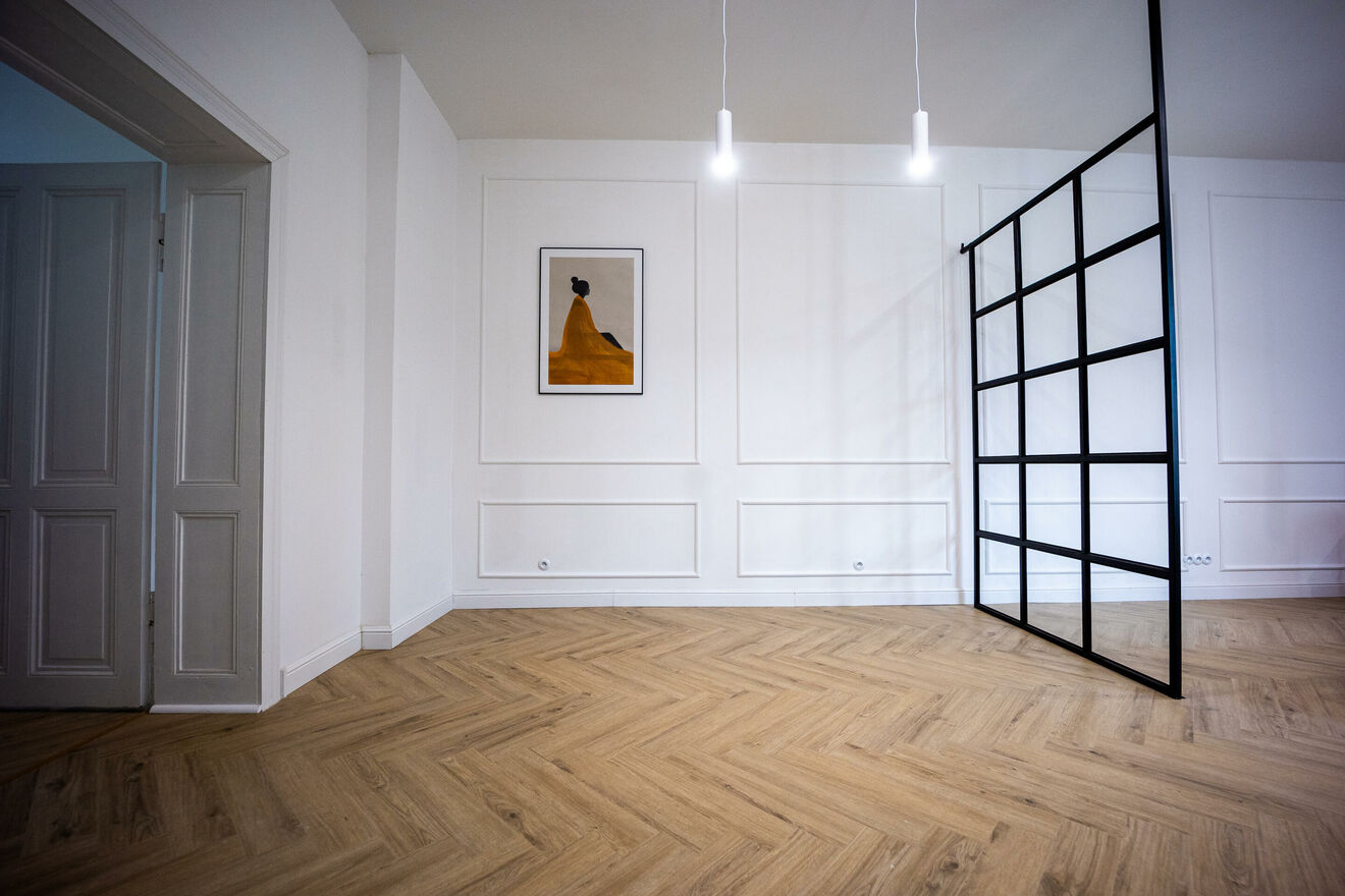 Ściany wygładzone, pomalowane oraz ozdobione sztukaterią. Na podłodze piękne panele ułożone w jodełkę.