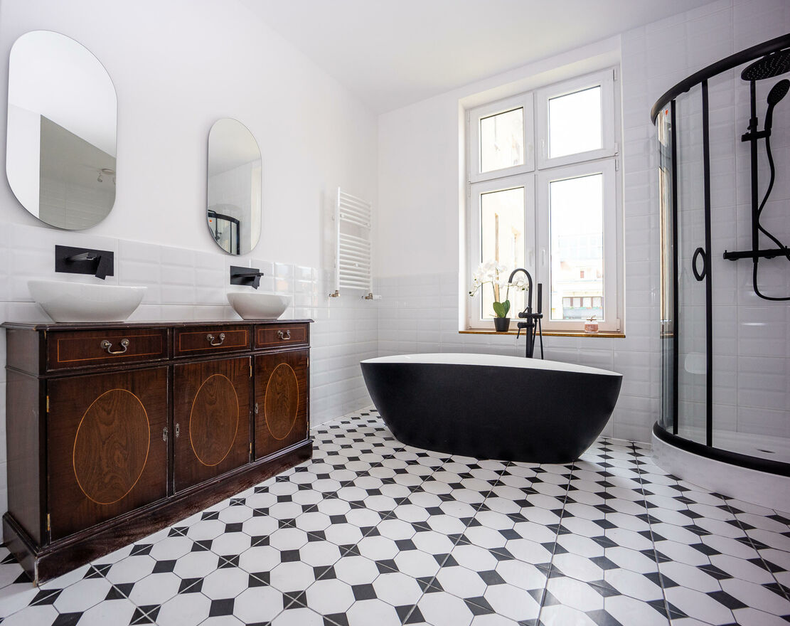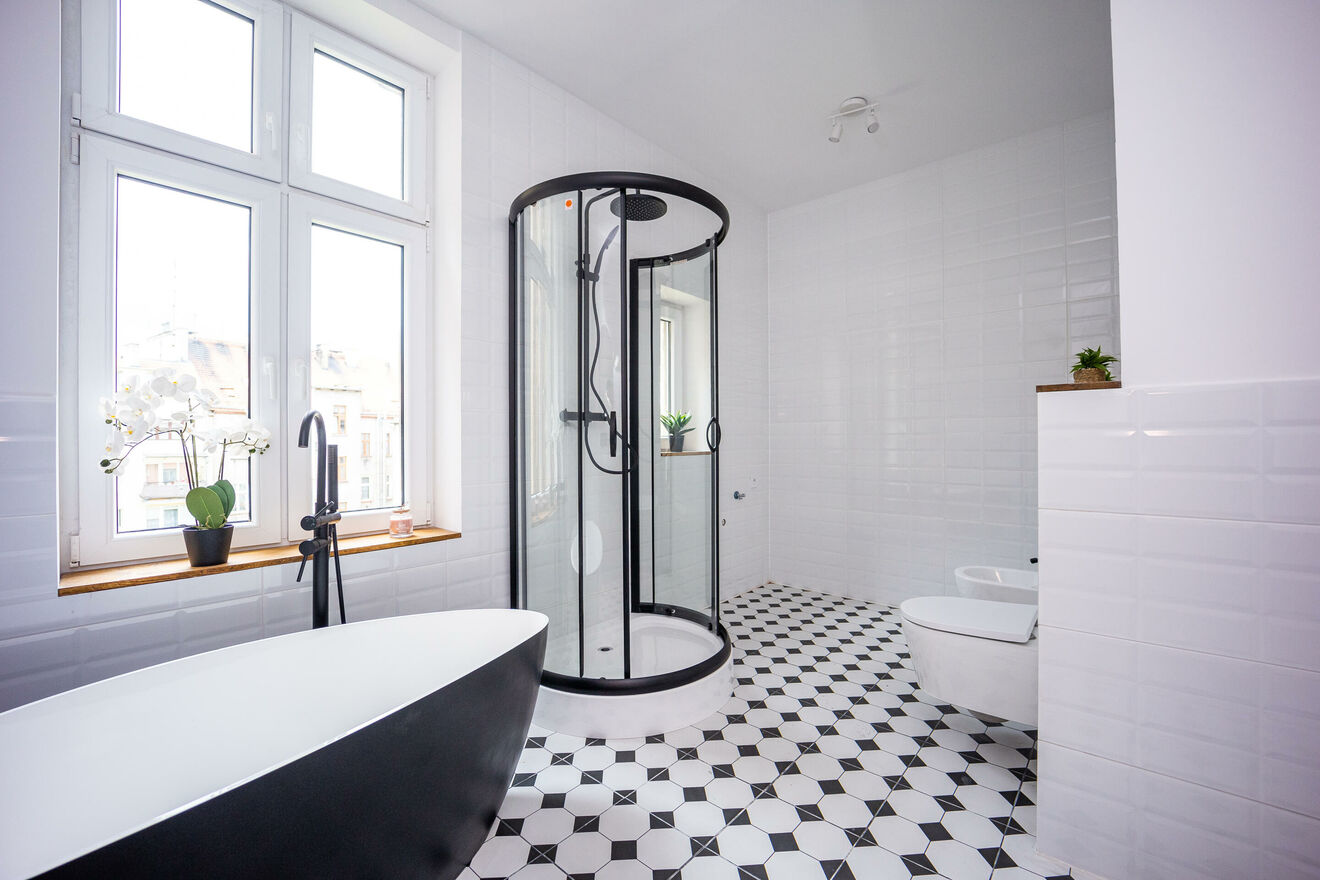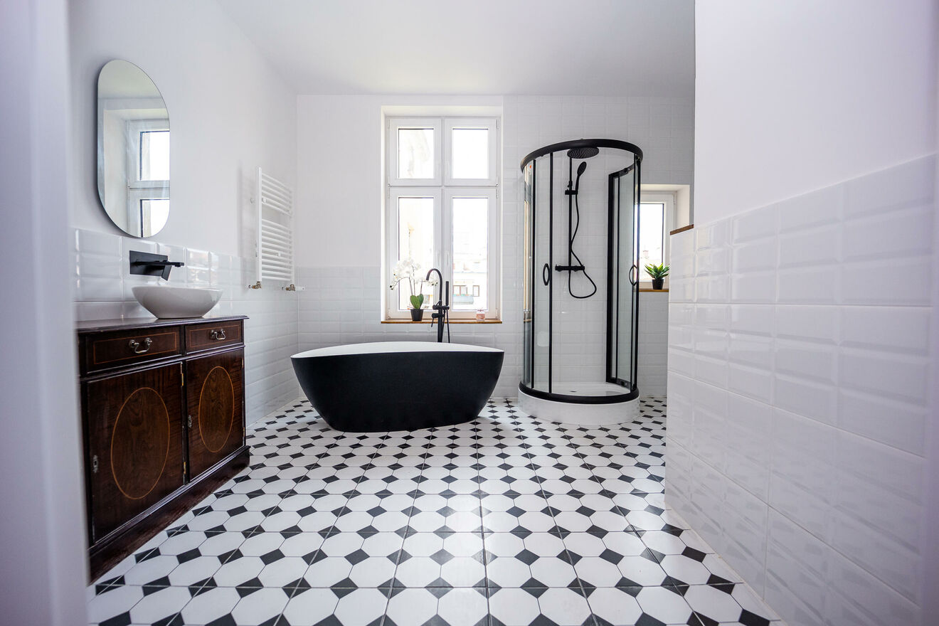 - pokój kąpielowy wyposażony w 2 umywalki, wannę wolnostojącą, kabinę prysznicową, WC oraz bidet;