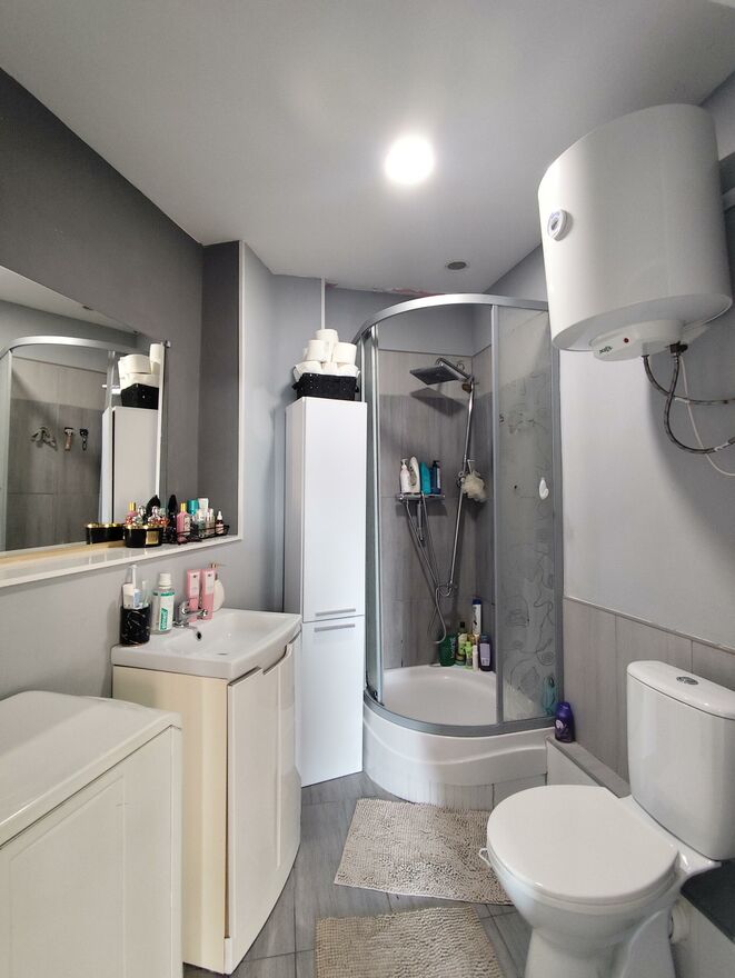 Łazienka: Nowoczesna, wyposażona w kabinę prysznicową.