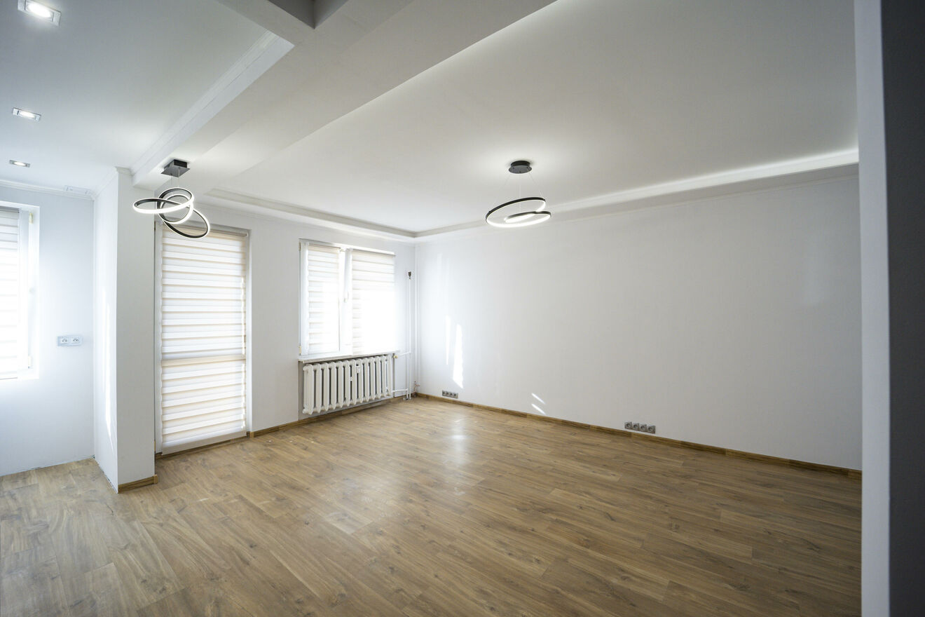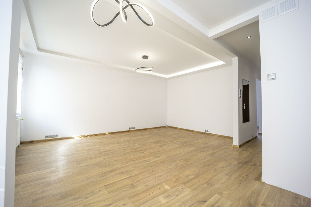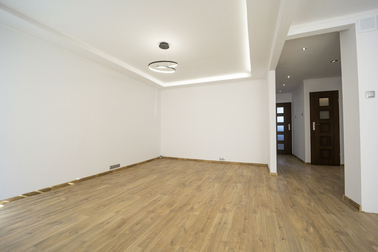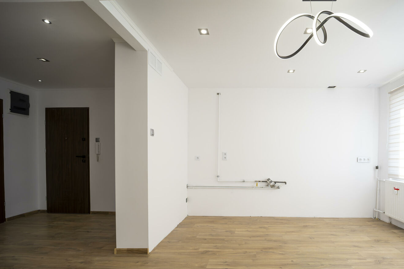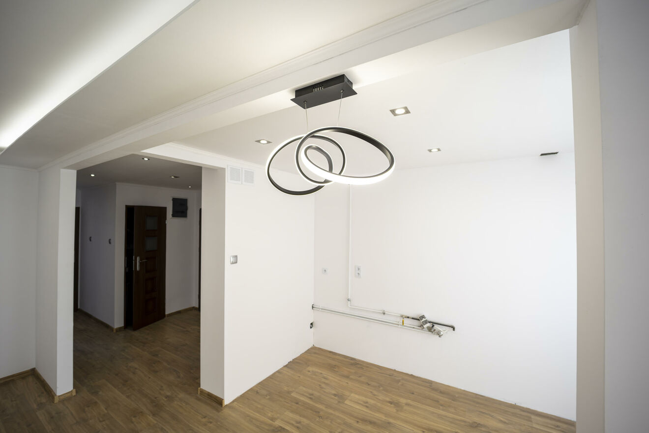 Standard: Nowa instalacja elektryczna, ściany świeżo malowane na biało, nowoczesne sufity podwieszane z oświetleniem LED i efektowne lampy.