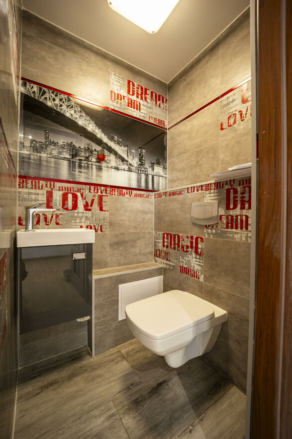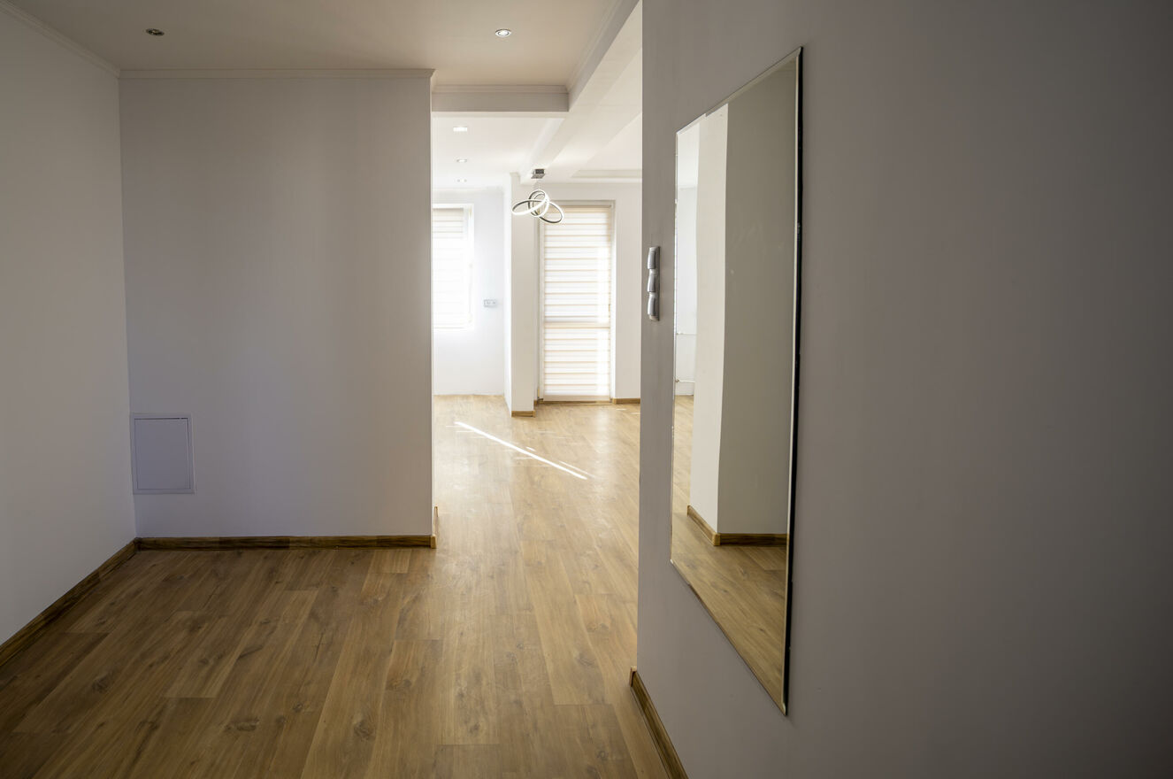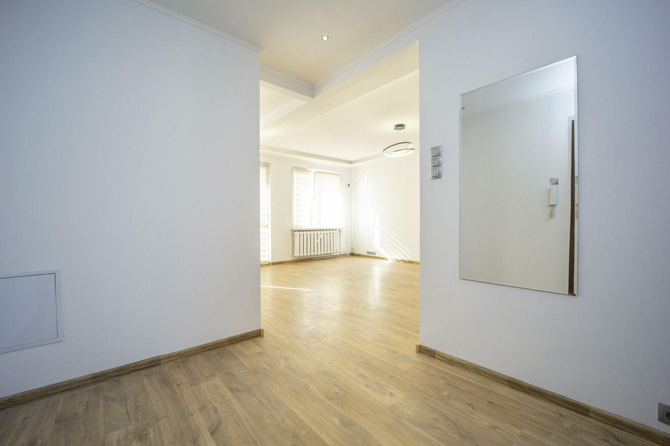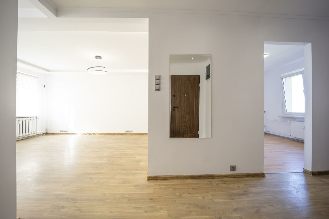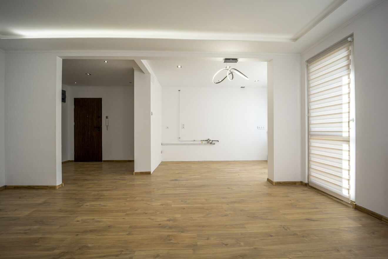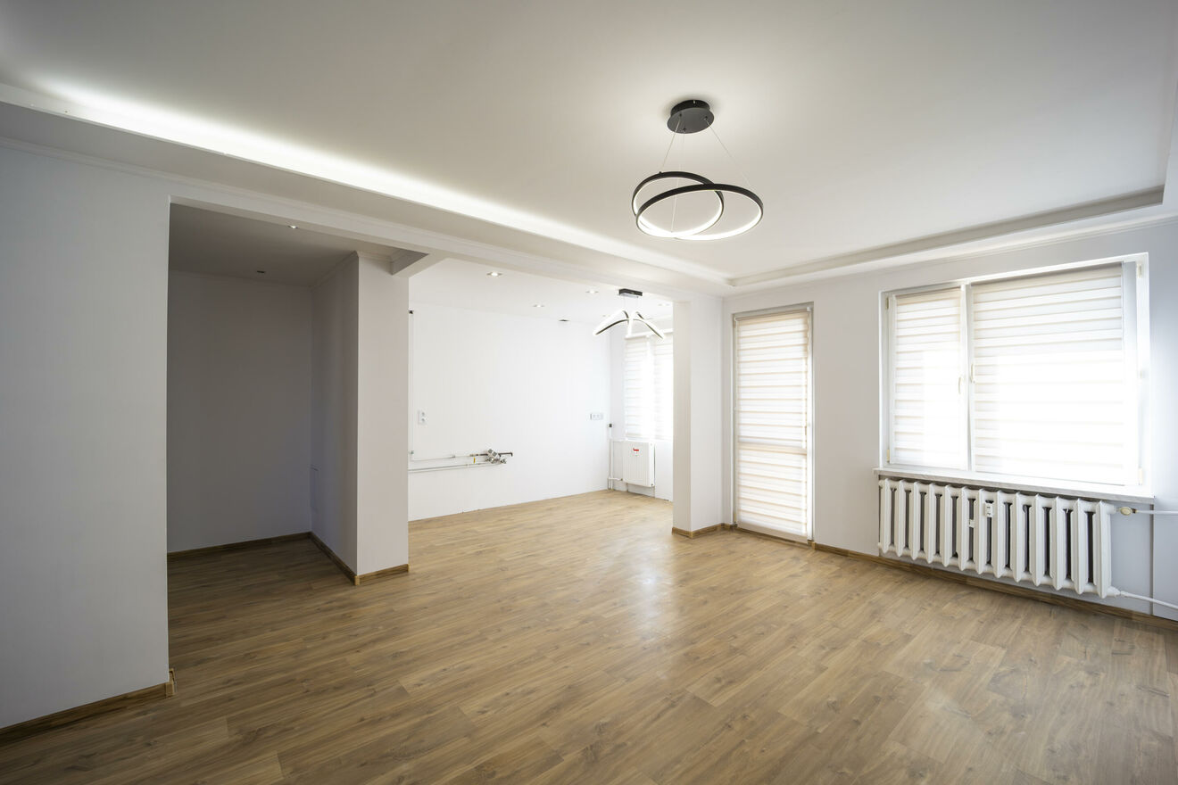 Standard: Nowa instalacja elektryczna, ściany świeżo malowane na biało, nowoczesne sufity podwieszane z oświetleniem LED i efektowne lampy.