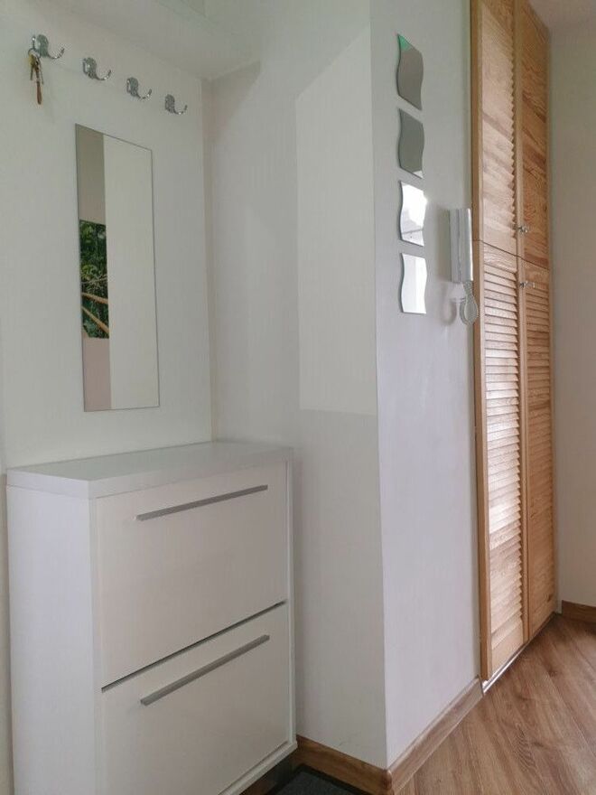 W przedpokoju pojemna szafa garderobiana oraz praktyczna szafka na buty i garderoba na okrycia wierzchnie.