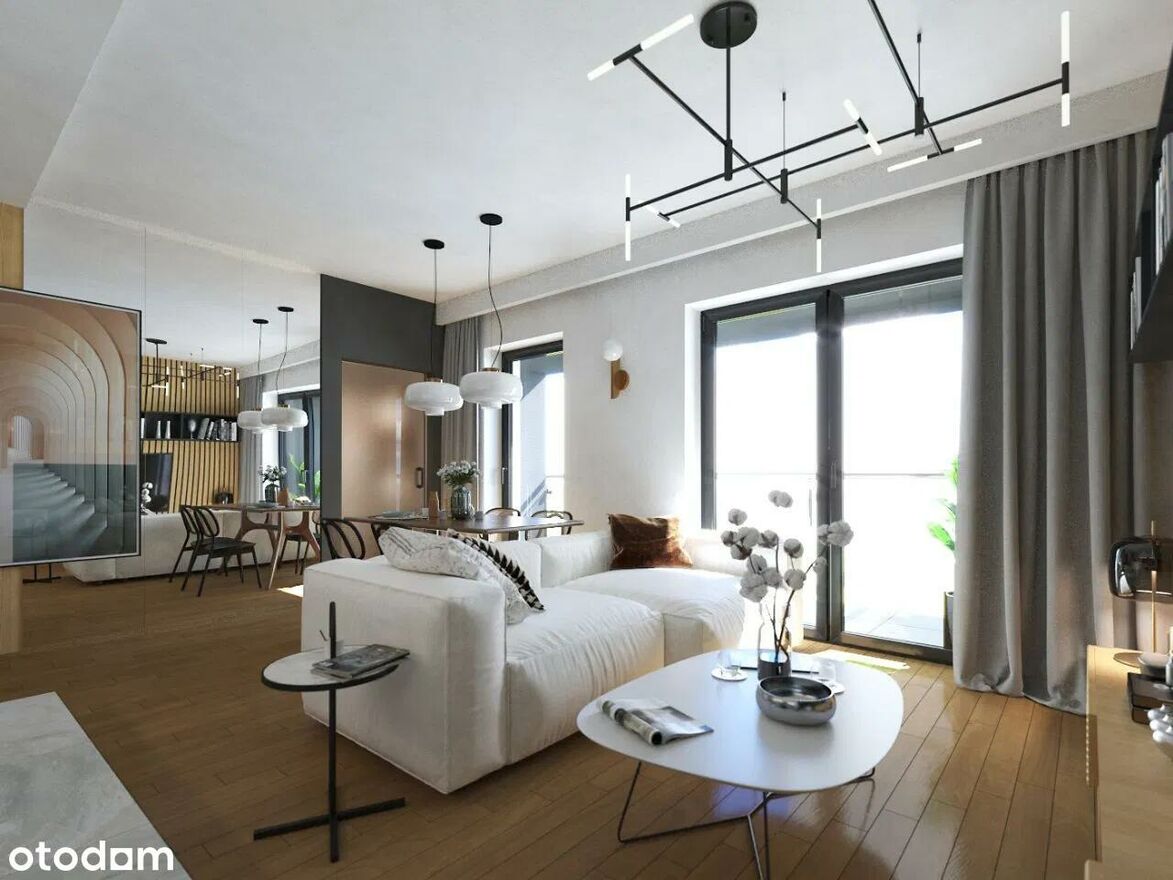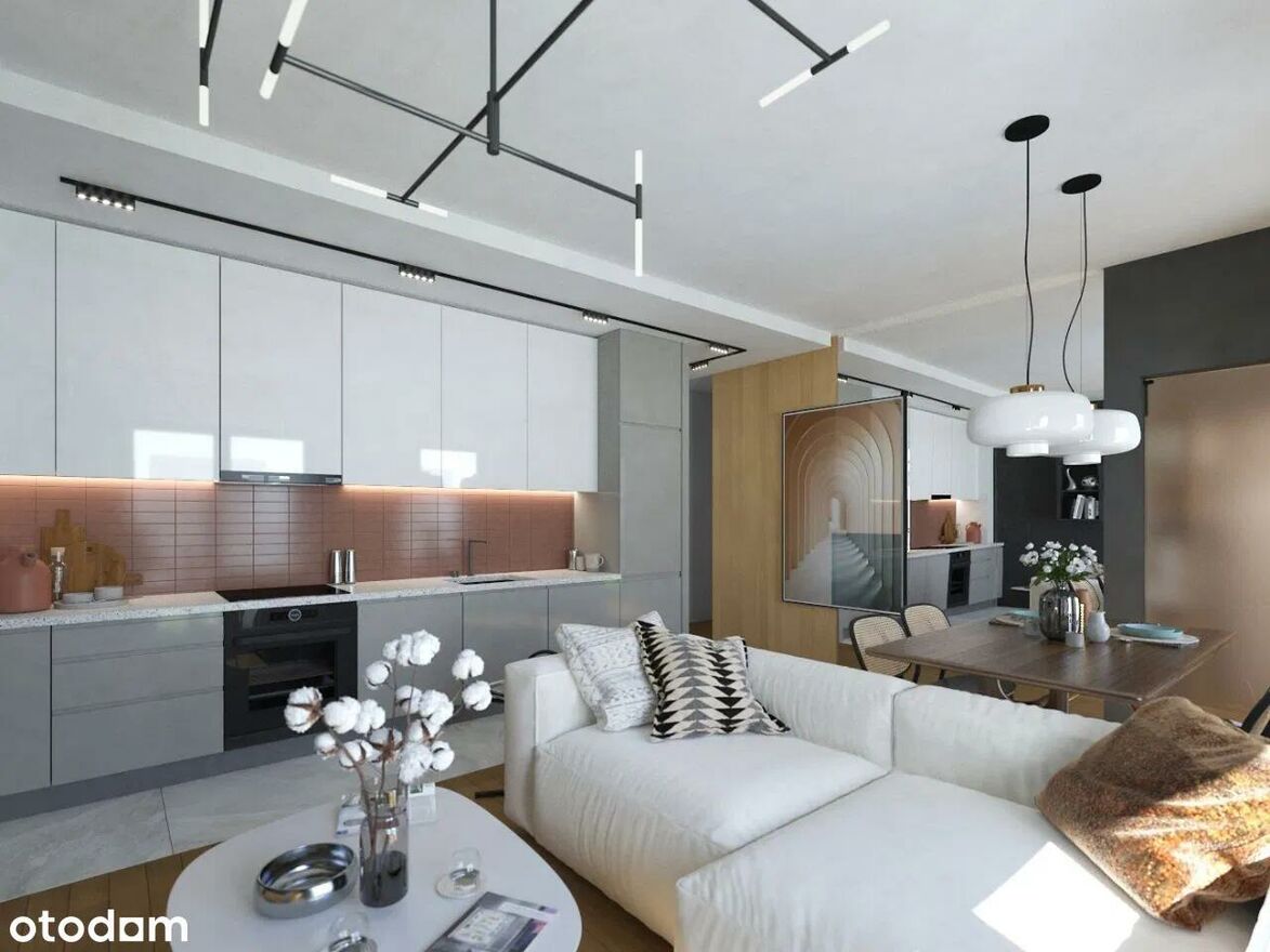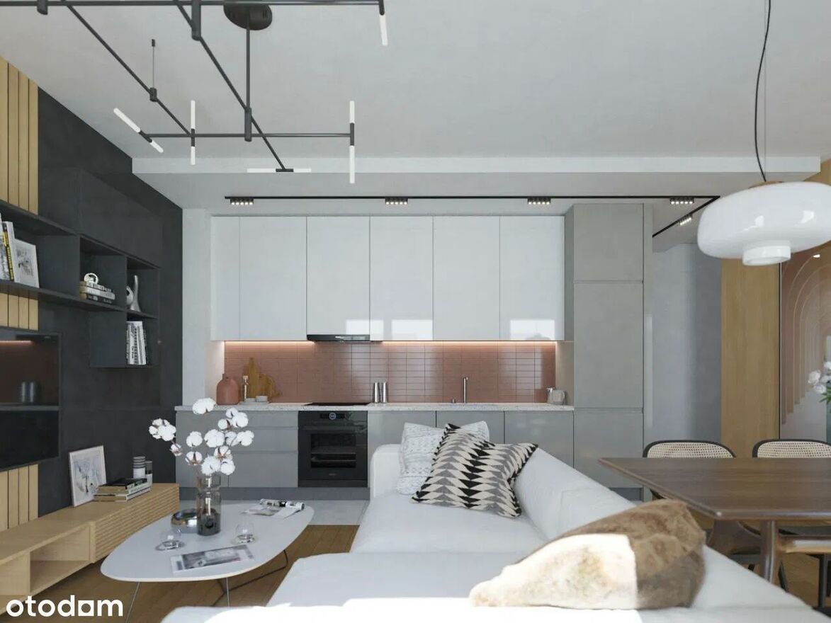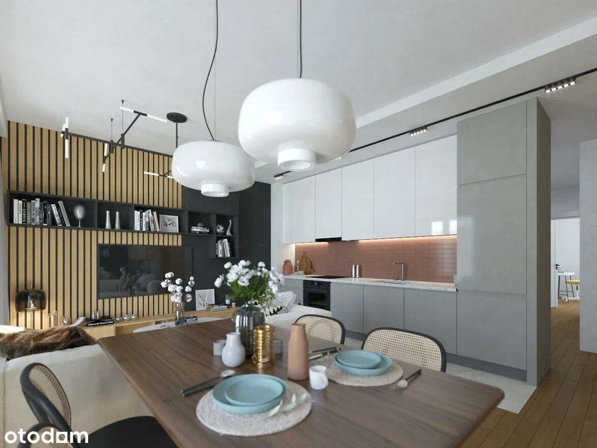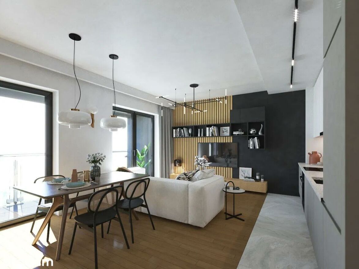 - Salon z aneksem kuchennym i wyjściem na balkon