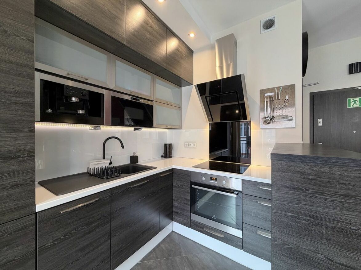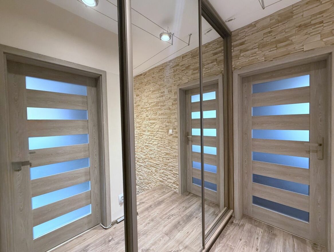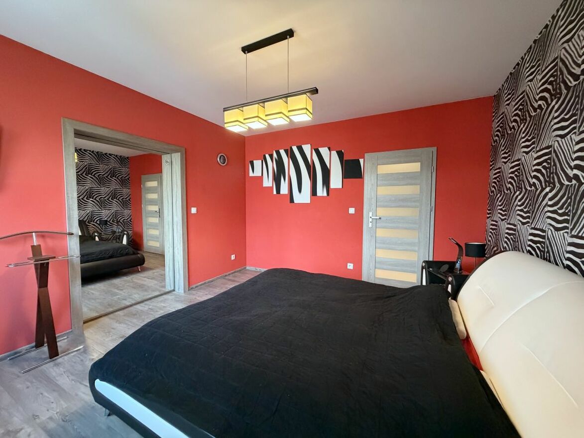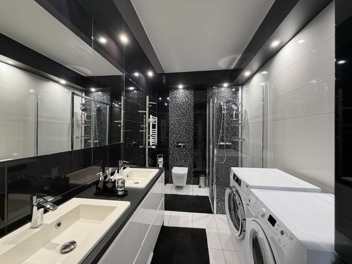 Dwupoziomowy charakter mieszkania zapewnia wyraźny podział przestrzeni, oferując mieszkańcom większą prywatność oraz poczucie przestronności. Dodatkowym atutem jest garderoba dostępna bezpośrednio z sypialni, co zwiększa wygodę codziennego użytkowania.