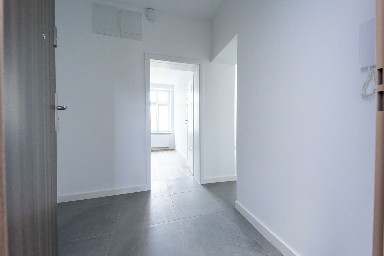 Mieszkanie po generalnym remoncie, na podłodze panele winylowe oraz gustowny gres, na ścianach tynki maszynowe oraz wodoodporna farba lateksowa.
